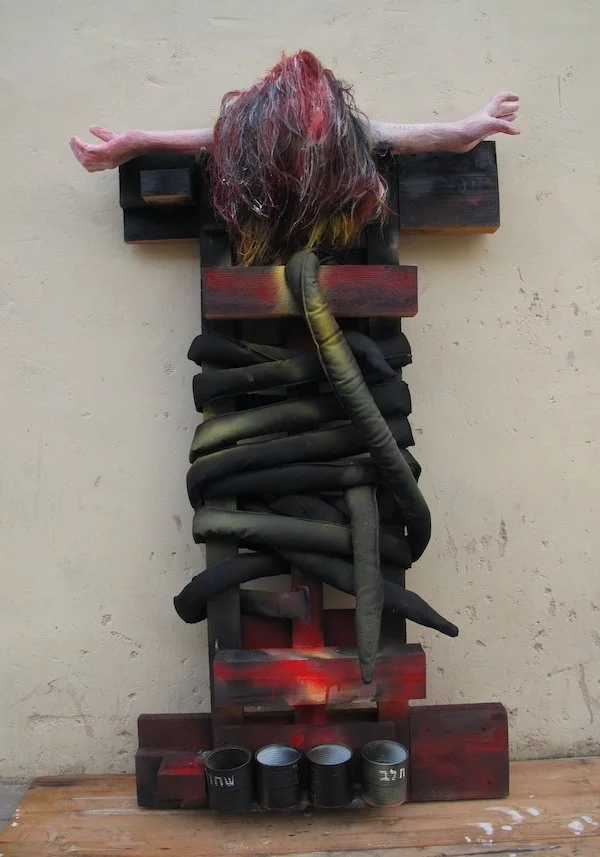 Image from Paul Celan’s poem ‘Todesfuge’ (Death Fugue), wood, cloth, hair, tin cups, spray paint, 138 x 90 cm